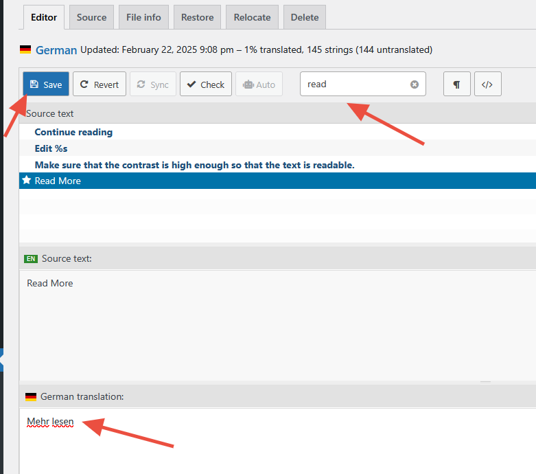 Плагін Loco translate також показує прогрес перекладу, скільки всього рядків та скільки ще потребує перекладу.