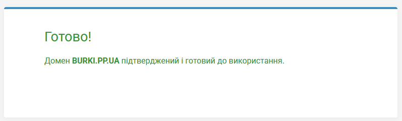 Заполняем три поля — вводим домен, телефон и код и получаем сообщение об успешной активации.