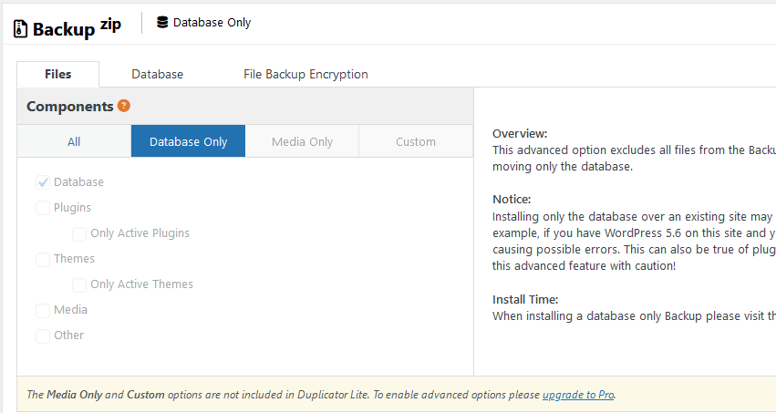 Если нужно сделать бекап только базы данных, то нажимаем на вкладку Backup и выбираем «database only».