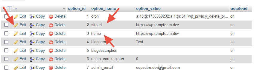 Чтобы открыть админку и сайт по новому адресу, нужно в таблице базы данных «wp_options» заменить доменное имя новым. Чтобы открыть таблицу, нажимаем на «Browse»