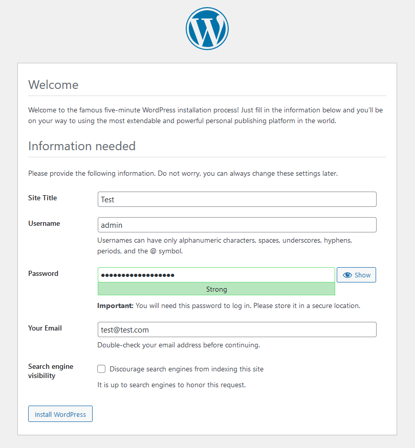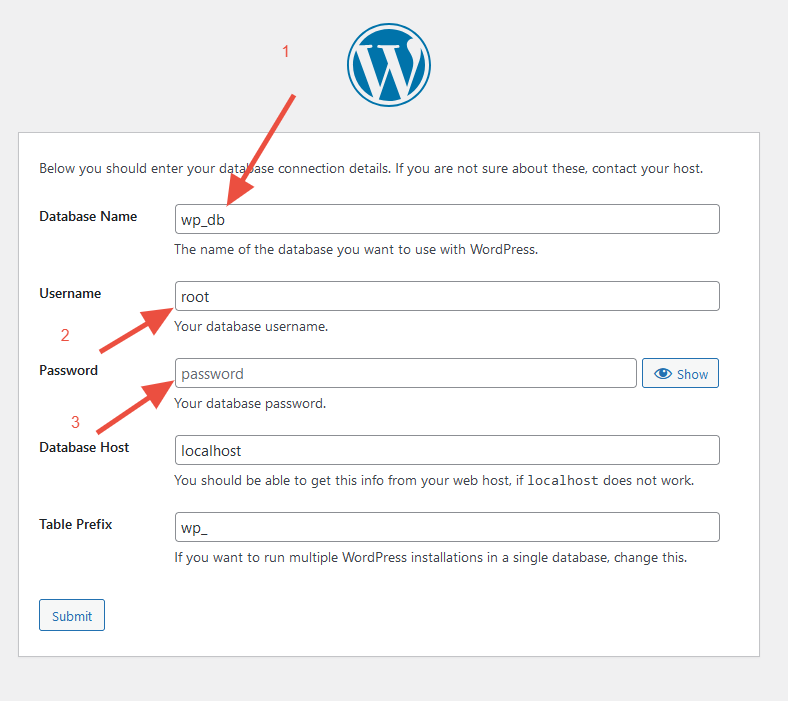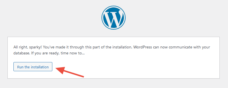 Натискаємо “Submit”, якщо все добре, то ми побачимо екран з кнопкою запуску встановлення WordPress