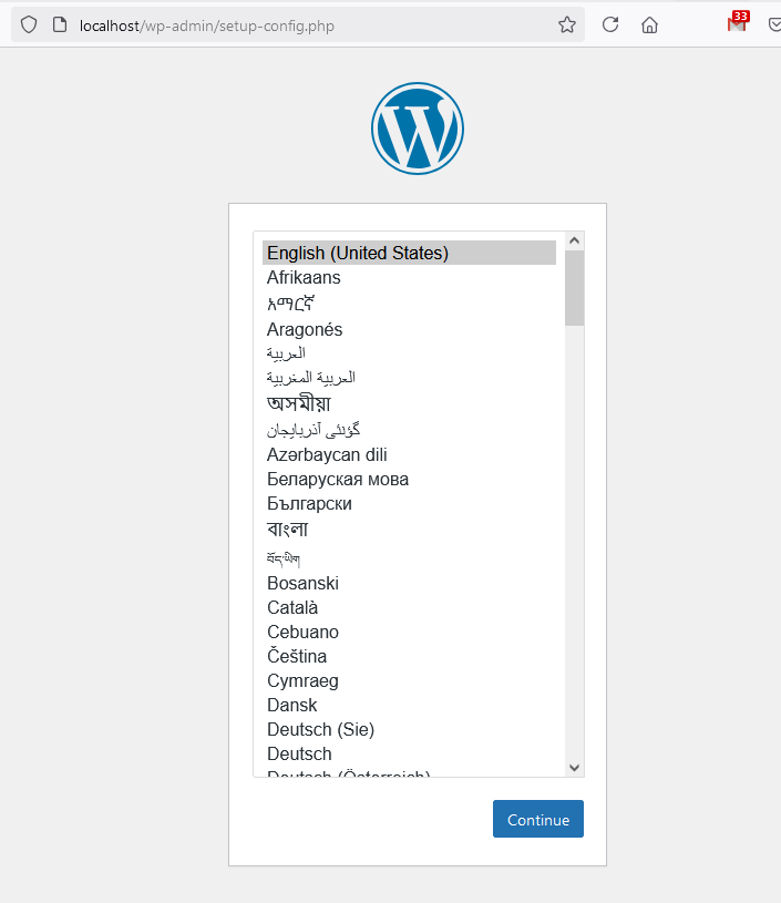 оновлюємо сторінку http://localhost і бачимо перший крок встановлення WordPress, на якому вибираємо мову