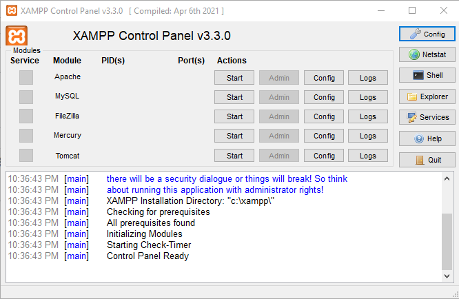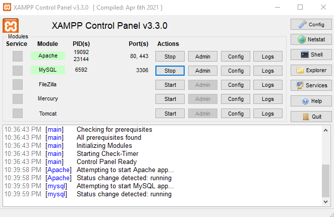 Нам потрібно запустити лише Apache+MySQL. Після запуску у них буде зелене тло. Якщо вони не потрібні, їх можна потім зупинити.