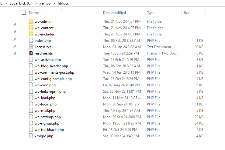 За замовченням XAMPP встановлюється на диск “C:/xampp/”, наш проєкт будемо розміщувати в папке “htdocs”. Все там видаляємо та распаковивваємо в директорію “htdocs” файли WordPress.