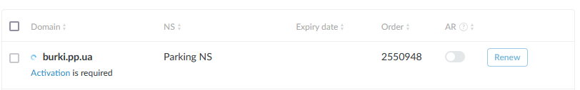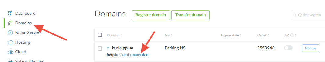 Після завершення процесу купівлі, переходимо в кабінет в розділ «домени» і бачимо наш домен, якій потребує щоб ми додали карту в кабінеті (спишуть разово 1 грн та повернуть за кілька годин).