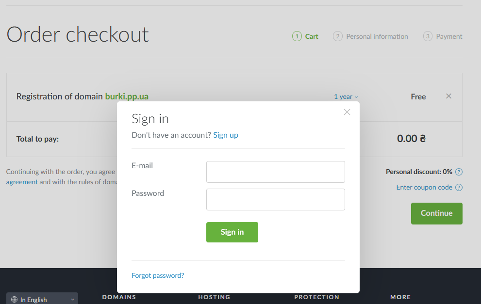 В процесі замовлення або створюємо акаунт на nic.ua, або входимо, якщо він вже у нас є.